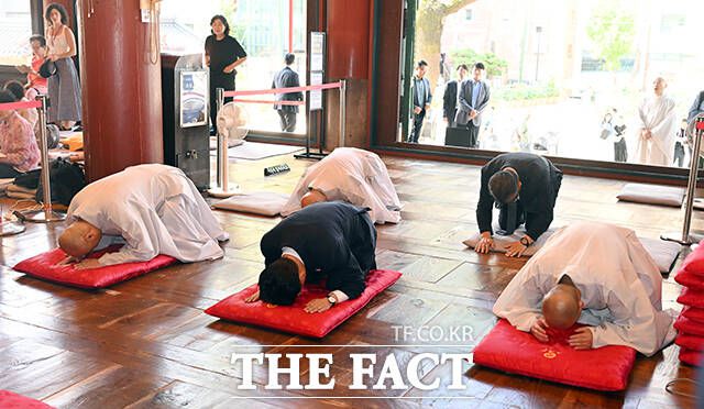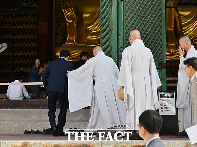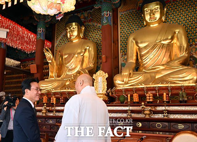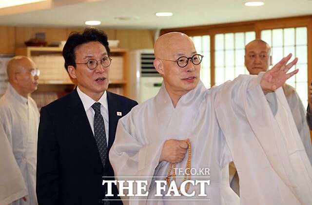 [더팩트ㅣ임영무 기자] 김민석 국무총리가 10일 오전 서울 종로구 조계사 대웅전을 찾아 진우 조계종 총무원장을 예방하고 있다.