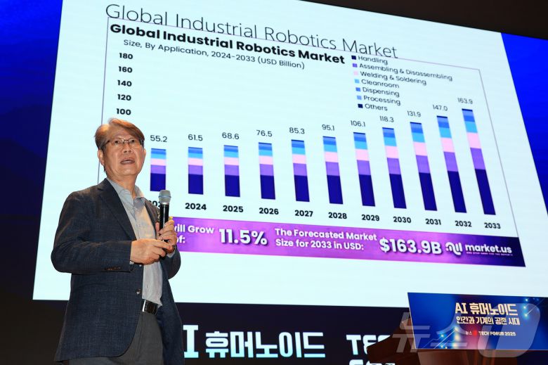 (서울=뉴스1) 박정호 기자 = 김진오 한국로봇산업협회 회장이 10일 오전 서울 여의도 한국거래소 컨퍼런스홀에서 'AI 휴머노이드, 인간과 기계의 공존 시대'를 주제로 열린 2025 뉴스1 테크포럼(NTF)에서 '로봇산업의 발전방향'을 주제로 기조연설을 하고 있다. 2025.7.10/뉴스1