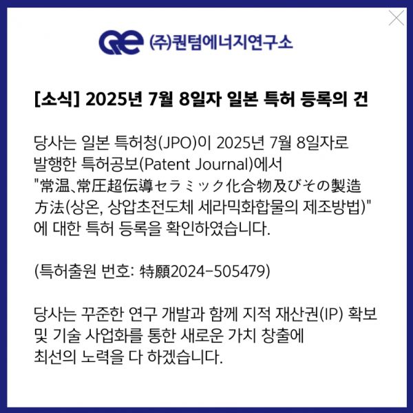 퀀텀에너지연구소, 상온·상압 초전도체 日 특허 등록…한국 이어 지식재산권 확보