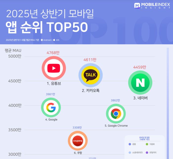 전체 앱중에는 유튜브가 4768만 MAU로 1위를 차지했고, 카카오톡이 4611만, 네이버가 4459만 MAU로 2, 3위를 차지했다.