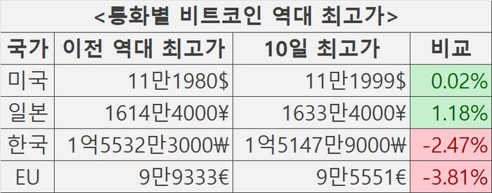 하지만 최근 관세쇼크 등으로 국가별 통화가치가 급등락하면서 한국이나 유럽에서는 역대 최고가를 경신하지 못한 것으로 나타났다.