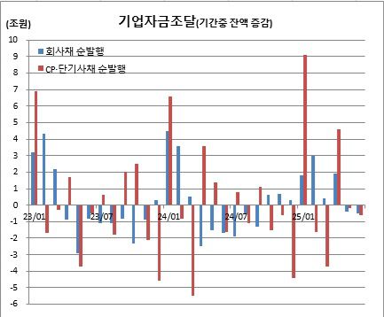 기업이 주요 자금조달 수단인 채권을 두달연속 순상환 것은 2023년 5~6월 이후 처음이다. 당시에는 회사채를 3조7000억원(5월 2조9000억원, 6월 8000억원), CP 및 단기사채를 4조2000억원(5월 3조7000억원, 6월 5000억원)씩 순상환한 바 있다.