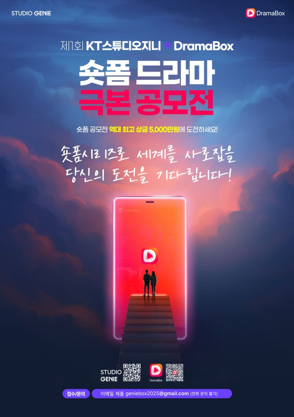 국내 대표 K-콘텐츠 스튜디오 KT스튜디오지니(대표이사 정근욱)와 글로벌 숏폼 플랫폼 드라마박스가 글로벌 숏폼 드라마의 미래를 선도할 크리에이터 발굴을 위해 '제1회 숏폼 시리즈 극본 공모전'을 연다.
