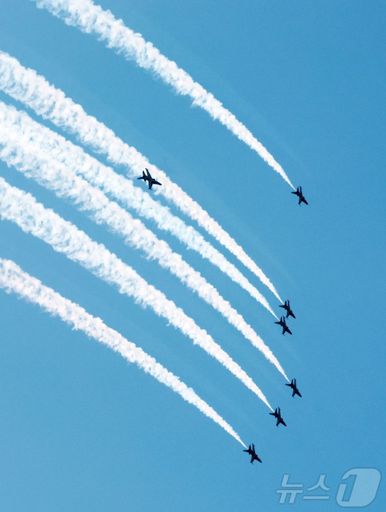 (서울=뉴스1) 박세연 기자 = 10일 오전 서울시내 상공에서 블랙이글스가 ‘방위산업의날 계기 시민참여행사 에어쇼’ 비행연습을 하고 있다. 방위산업의 날 계기 시민 참여 행사는 12일 반포한강공원 등지에서 개최된다. 2025.7.10/뉴스1