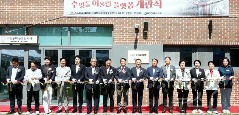 (대전=뉴스1) 이동원 기자 = 대전 서구(구청장 서철모)는 지난 9일 정림동 ‘수밋들 어울림 플랫폼’ 개관식을 지역 주민들의 높은 관심 속 성황리에 진행됐다고 밝혔다. 개관식에는 서철모 서구청장과 조규식 서구의회 의장, 이장우 대전광역시장 등 주요 내빈과 지역 주민 등 100여 명이 참석했다. 수밋들 어울림 플랫폼은 정림동 도시재생 뉴딜사업의 일환으로, 총사업비 194억 원이 투입된 복합 문화시설이다. 전체 면적 5,631.48㎡ 규모로 지하 2층 및 지상 4층으로 조성됐으며, 2023년 2월 착공해 작년 12월 준공했다. (대전서구 제공. 재판매 및 DB금지)2025.7.10/뉴스1