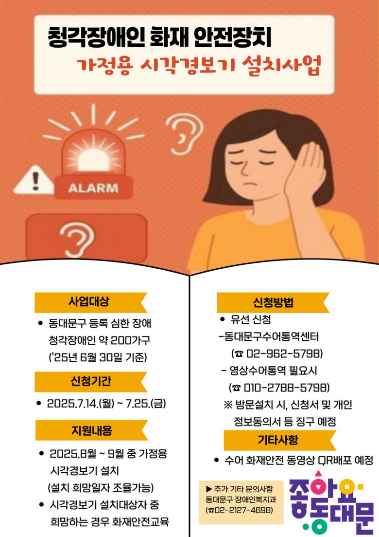 구는 청각장애인이 화재 발생 시 음향 경보를 인식하기 어려운 만큼 개인용·시설용 시각경보기를 설치하고, 설치 대상자 관리와 화재 안전을 위한 수어 동영상 제작, 소방서와 함께하는 교육 등을 진행한다.