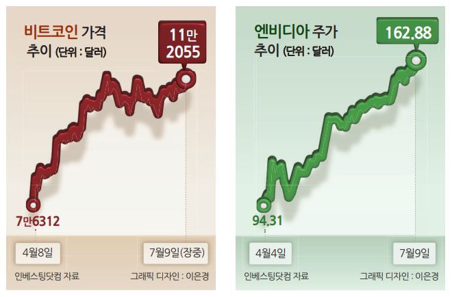 미국 뉴욕증시 주요 주가지수와 비트코인 가격이 사상 최고치 랠리를 펼치고 있다. 금리 인하 속도 논쟁, 고율 관세 부과 등 각종 불확실성 리스크가 주요 투자 자산들의 발목을 잡을 만도 하지만, 이를 극복하고 전인미답의 영역에 발을 들이며 내달리고 있기 때문이다.