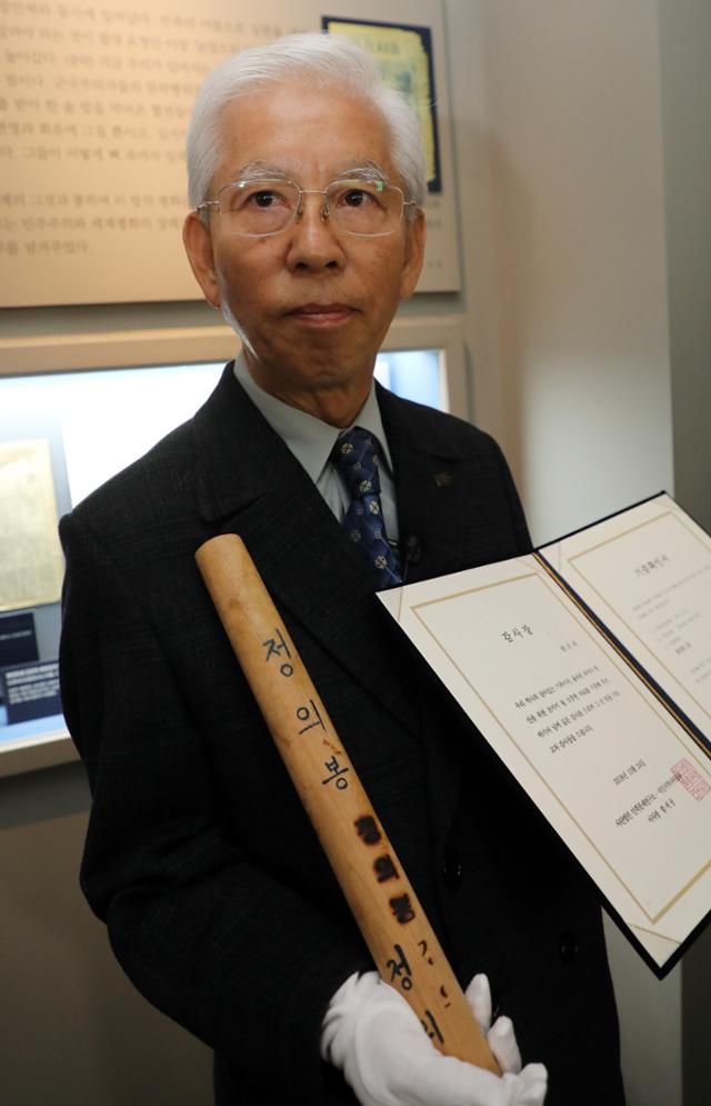 백범 암살범 안두희 전 육군 소위를 살해한 박기서씨가 2018년 10월 24일 당시 서울 용산구 식민지역사박물관에서 안두희를 처단하는 데 쓴 '정의봉'을 기증하고 있다. 연합뉴스 |