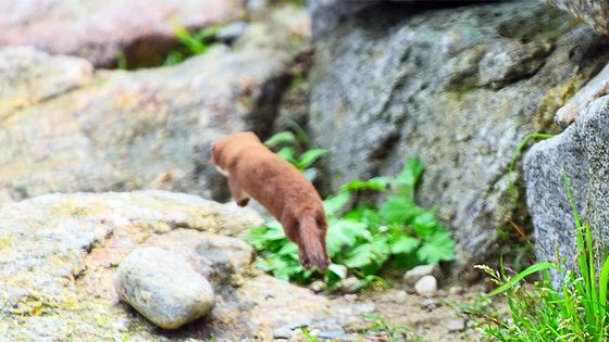 2017년 7월 1일 지리산 국립공원에서 처음 발견된 무산쇠족제비가 돌 무더기 사이에 은신하고 있다. 사진 국립공원공단 |