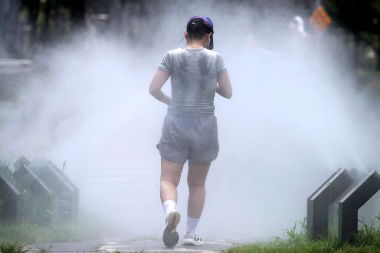 지난 3일 대구 중구 김광석길 입구 산책로에서 달리기하던 한 시민이 쿨링포그 사이를 걸으며 숨을 고르고 있다. 뉴스1