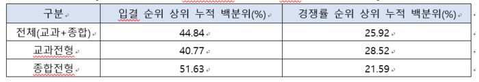 무전공학과 입시결과(최종등록자 교과성적) 순위는 상위 누적 평균 44.84%였다. 서울시립대 교과전형 자유전공학부(인문)의 경우, 15개 모집학과 중 입시결과가 가장 높았고, 숭실대 교과전형 자유전공학부(인문) 또한 25개 학과 중 두 번째로 입시결과가 높았다.