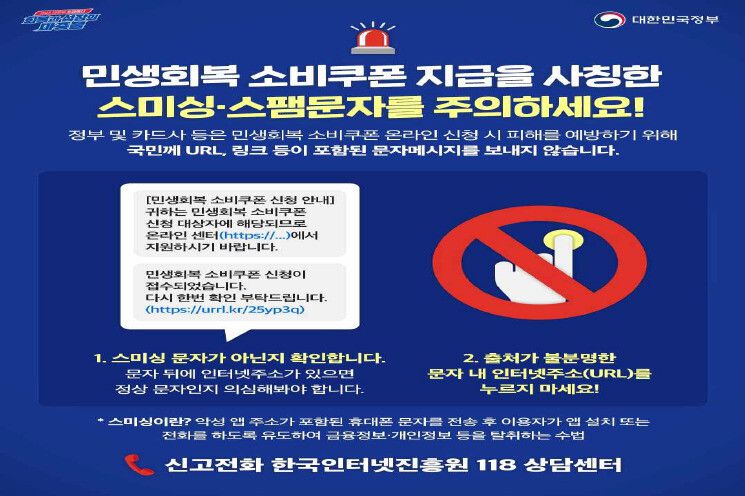 정부가 ‘민생회복 소비쿠폰’ 지급을 앞두고 문자 결제사기(스미싱) 피해를 막기 위해 공식 문자에 ‘인터넷 주소 바로가기(URL)’ 링크를 포함하지 않기로 했다.