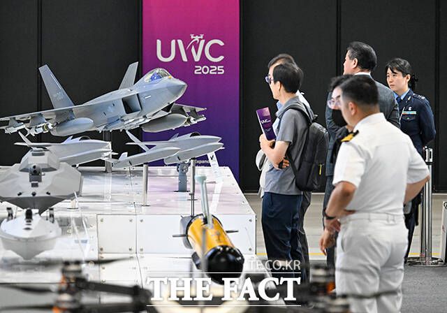 '2025 무인이동체산업체엑스포 & 2025 자율주행모빌리티산업전'이 10일 오전 서울 강남구 코엑스에서 열린 가운데 관람객들이 국군 무인기를 살펴보고 있다. /장윤석 기자