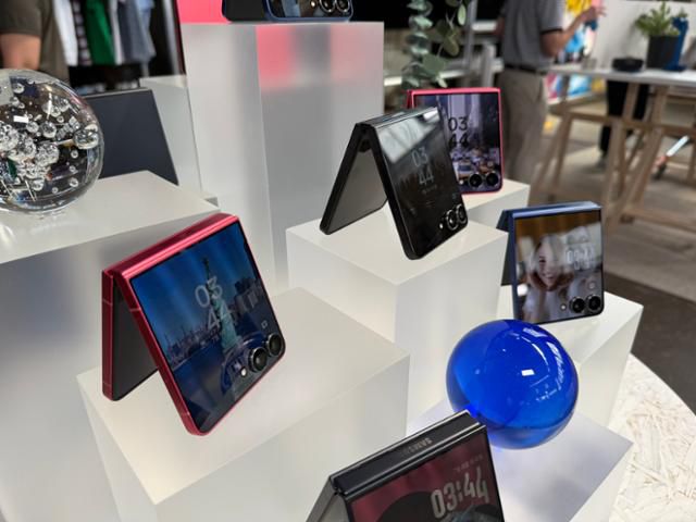 삼성전자가 9일 뉴욕 브루클린 듀갈 그린하우스에서 열린 신제품 공개 행사 '갤럭시 언팩 2025'에서 신형 폴더블 스마트폰 갤럭시 Z 폴드7 및 플립7을 전 세계에 소개했다. 사진은 전시된 Z 플립7의 모습. 뉴욕=연합뉴스 |