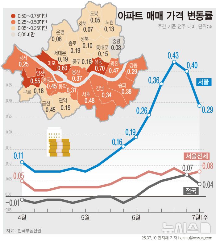 서울(0.40%→0.29%)은 1주 전보다 상승률이 0.11%포인트(p) 감소하며 이번 대출규제에 가장 민감하게 반응했다. 6월 이후 상승률 추이를 살펴보면 6월2일 0.19%→6월9일 0.26%→6월16일 0.36%→6월23일 0.43%로 빠르게 치솟다가 대출규제 발표 직후인 6월30일 0.4%→7월7일 0.29%로 하락했다. 2주 새 0.14%p 떨어지며 6월 초중순 수준으로 돌아간 셈이다.