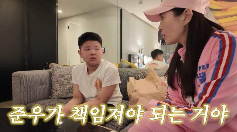 조명이 산산조각나자, 당황한 준우는 "엄마 죄송해요"라고 연신 사과했다. 장영란은 먼저 준우가 다쳤는지 살핀 다음 "반성하고 있어. 네가 직접 호텔 로비에 전화해서 '조명 깨졌다'고 말해라. 네 용돈에서 차감할 것"이라고 말했다.