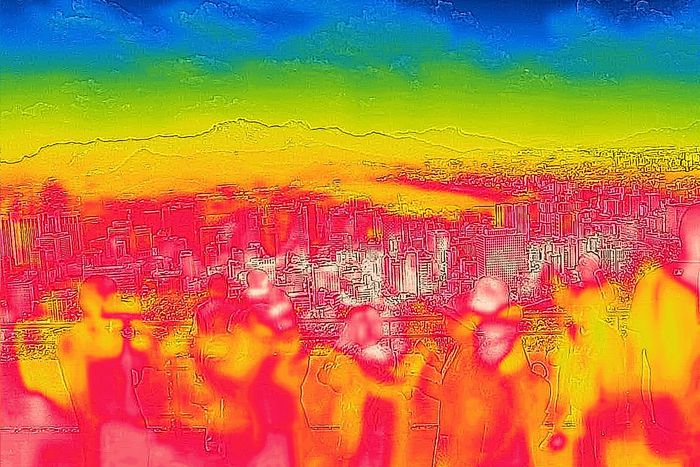 폭염이 이어진 지난 9일 서울 남산에서 바라본 도심 모습을 열화상 카메라로 촬영한 모습. 온도가 높은 곳은 붉게, 낮은 곳은 푸르게 표시돼 있다. [연합뉴스] |