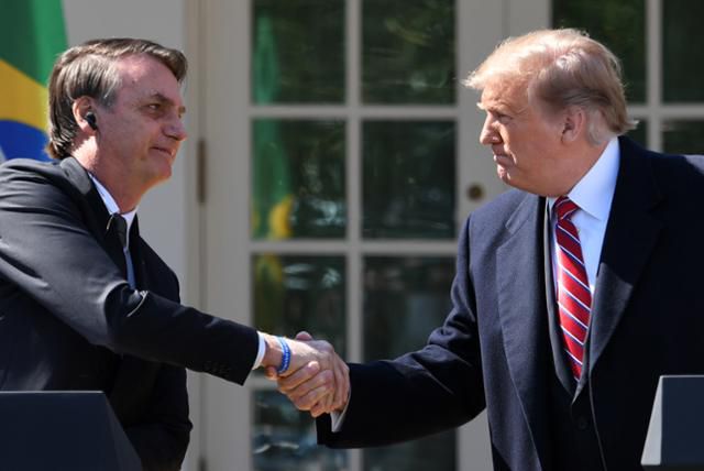 2019년 3월 19일 집권 1기 당시 도널드 트럼프(오른쪽) 미국 대통령과 자이르 보우소나루 당시 브라질 대통령이 공동 기자회견이 열린 워싱턴 백악관 로즈가든에서 악수하고 있다. UPI 연합뉴스 자료사진
