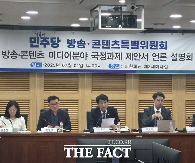 여권이 한국언론진흥재단이 독점으로 수행하는 정부광고 대행업무를 한국방송광고진흥공사와 나누는 법 개정의 필요성을 제기하고 있다. 사진은 이훈기(가운데) 민주당 방송콘텐츠특별위원회 위원장이 지난 1일 국회에서 열린 방송콘텐츠 미디어분야 국정과제 제안서 언론 설명회에서 발언하는 모습. /김시형 기자