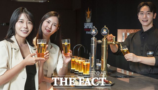 [더팩트ㅣ이새롬 기자] 삿포로 프리미엄 비어스탠드 매장이 오픈을 앞둔 10일 서울 성동구 매장에서 모델들이 삿포로 프리미엄 맥주를 들고 포즈를 취하고 있다.