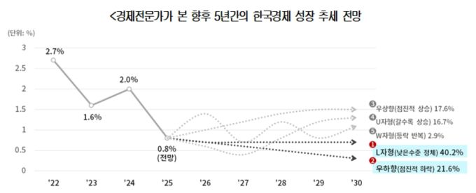 2026~2030년의 5년간 우리나라의 성장 추세에 대한 전망을 묻는 질문에 전문가의 40.2%가 성장률이 '낮은 수준에서 정체되는 L자형'을 보일 것으로 우려했으며, 21.6%는 '점진적인 우하향' 추세를 나타낼 것이라고 응답했다. 전문가 10명 중 6명(61.8%)이 우리 경제의 성장동력이 약해질 것이라고 본 것이다.