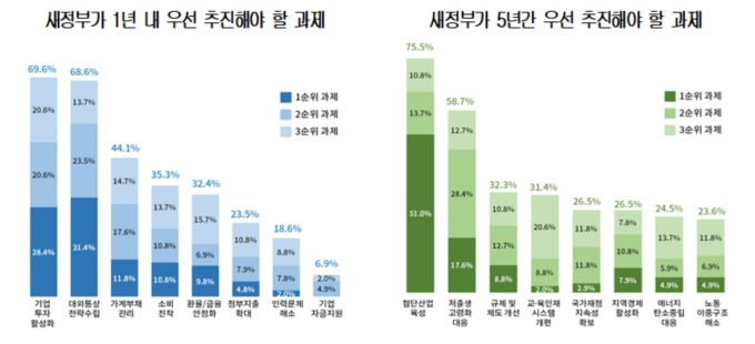 향후 5년간 중점적으로 추진할 정책으로는 '미래 첨단산업 육성'이 75.5%로 가장 높았고, '저출생·고령화 대응'(58.7%), '규제 개선'(32.3%), '인재양성'(31.4%), '재정·사회보험 지속가능성 확보'(26.5%), '지역경제 활성화'(26.5%) 등의 응답이 뒤를 이었다. 에너지시스템 전환·탄소중립 대응 24.5%, 노동시장 이중구조 해소 23.6%, 기타 1%다.
