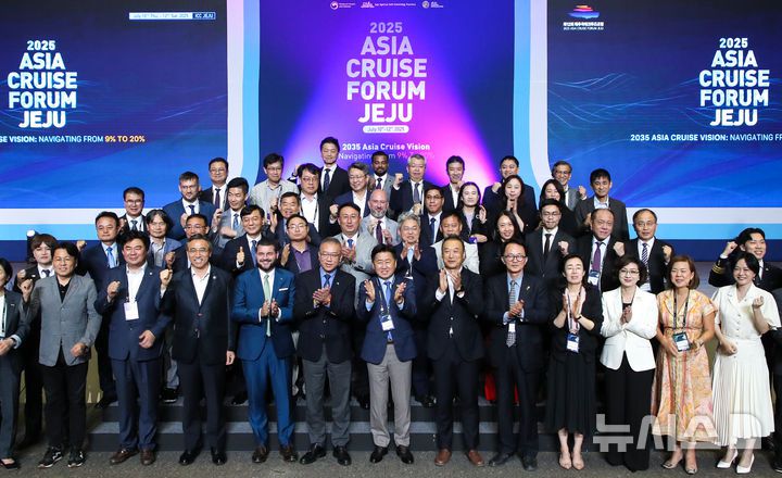 [서귀포=뉴시스] 우장호 기자 = 10일 오후 제주 서귀포시 제주국제컨벤션센터(ICC)에서 열린 '제12회 제주국제크루즈 포럼' 개막식에서 국내외 참석자들이 기념촬영을 하고 있다. 해양수산부와 제주도가 주최하고 제주관광공사가 주관하는 이번 포럼에서는 크루즈 관광의 지속가능한 발전방향과 아시아 크루즈 시장 확대 전략, 제주의 글로벌 허브 도약을 위한 협력 방안을 집중 논의한다. 2025.07.10. woo1223@newsis.com |