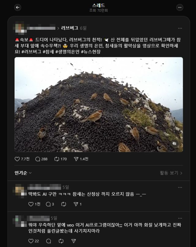 다행히 SNS 이용자들은 이미 해당 영상이 AI 생성 콘텐츠라는 사실을 빠르게 간파했다. 지난 3일 한 누리꾼이 스레드에 “속보 드디어 나타났다. 러브버그의 천적! 생명의 은인 참새의 활약상을 영상으로 확인하라”며 해당 영상을 게시하자 “딱 봐도 AI구만ㅋㅋ 참새는 산정상까지 안 올라감”, “뭐야? 우측 하단에 Veo, 이거 AI 프로그램이잖아. 사기치지 마라”는 댓글이 즉각 달렸다. 해당 영상은 현재까지 70만 회 이상의 조회수를 기록하며 빠르게 확산됐다.