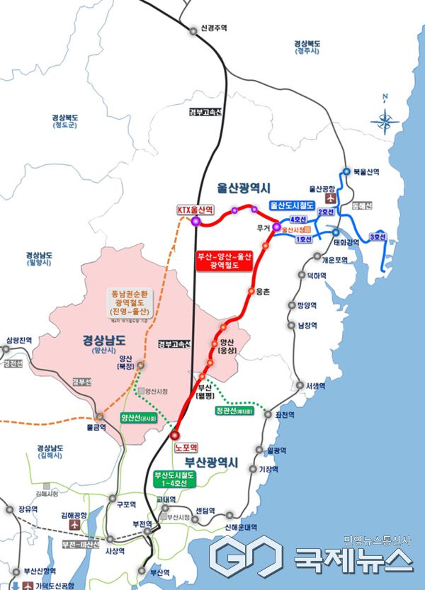 (경남=국제뉴스) 황재윤 기자 = 부산에서 양산을 거쳐 울산을 연결하는 '부산~양산~울산광역철도' 예비타당성 조사가 통과함에 따라 향후 광역철도노선이 완성되면 경남 양산과 부산, 울산은 1시간 생활권이 실현될 전망이다.