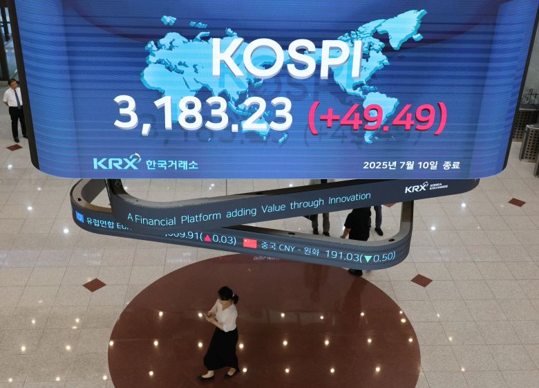 코스피지수는 지난 4월 도널드 트럼프 미국 행정부의 상호 관세 발표 충격으로 2284.72까지 밀렸다가, 이날 3183.23으로 장을 마치면서 연고점을 새로 썼다. 정치적 불확실성 해소, 달러 약세 등이 맞물리며 외국인 투자자가 ‘사자’로 돌아선 영향이 컸다.