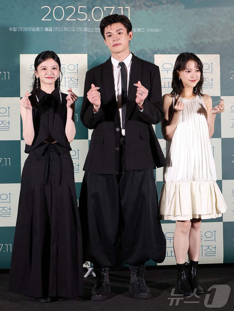(서울=뉴스1) 김진환 기자 = 대만 배우 진연비(왼쪽부터)와 구이태, 항첩여가 10일 오후 서울 용산구 CGV용산아이파크몰에서 열린 영화 ‘우리들의 교복시절’ 언론시사회에 참석해 포즈를 취하고 있다. '우리들의 교복시절'은 대만 명문고 야간반에 입학한 '아이'와 같은 책상을 쓰는 주간반 엘리트 '민'이 절친이 되지만, 제일고 인기남 '루커'를 동시에 좋아하며 삼각관계가 되는 이야기로 오는 11일 개봉한다. 2025.7.10/뉴스1