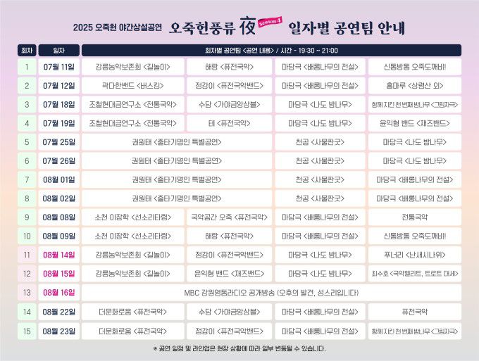 '오죽헌 풍류야(夜)'라는 이름으로 펼쳐지는 이번 시즌4 공연은 전통 마당극과 국악뿐 아니라 밴드와 버스킹 등 퓨전 공연까지 아우른다. 역사적·문화적 인프라가 뛰어난 오죽헌 공간 특성을 살린 지역문화관광 콘텐츠로 기대를 모으고 있다.
