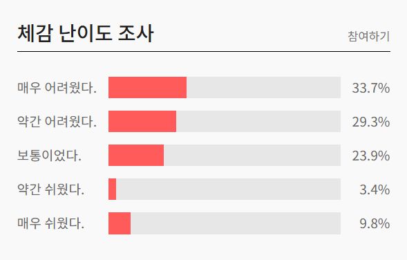 이날 오후 5시 10분 기준 EBSi 체감 난이도 조사에 따르면 '매우 어려웠다'가 33.7%로 가장 높은 수치를 나타내고 있다. 이어 '약간 어려웠다'가 29.3%, '보통이었다'가 23.9%를 기록했다.