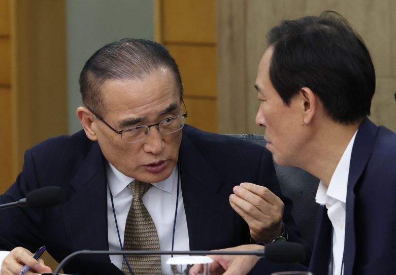 위성락 국가안보실장(왼쪽)과 우상호 정무수석이 10일 오후 서울 용산 대통령실에서 열린 수석·보좌관 회의에서 대화를 하고 있다. 대통령실사진기자단