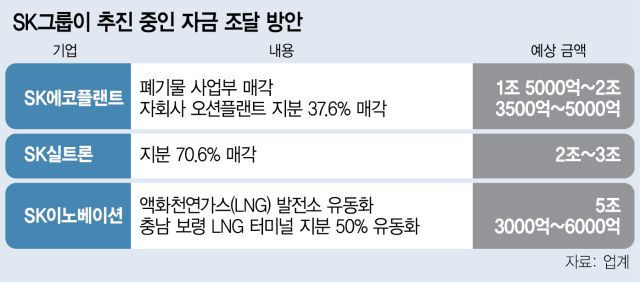 10일 투자은행(IB) 업계에 따르면 SK그룹은 SK이노베이션과 SK에코플랜트를 중심으로 10조원 가까운 자금 조달을 추진하고 있다. SK이노베이션의 액화천연가스(LNG) 발전소 유동화가 자산 가치 기준 5조 원으로 가장 많고 이와 별개로 충남 보령에 있는 LNG터미널 지분 50% 유동화, SK실트론 지분 70.6% 매각, SK에코플랜트 폐기물 사업부와 자회사 오션플랜트 지분 37.6%도 인수자를 찾고 있다. 이 밖에 SK텔레콤도 중장기적으로 통신 타워 등을 유동화하기 위해 해외 운용사로부터 관련 조언을 들은 것으로 전해졌다.