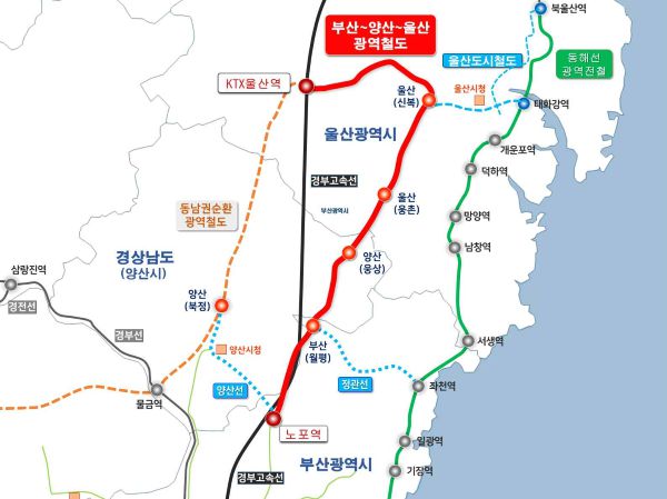 이 노선은 부산도시철도 1호선(노포역), 정관선, 양산선, 울산1호선 등 단절된 4개의 도시철도와 직접 연계돼 지역 내 교통망 효율성을 높일 예정입니다.