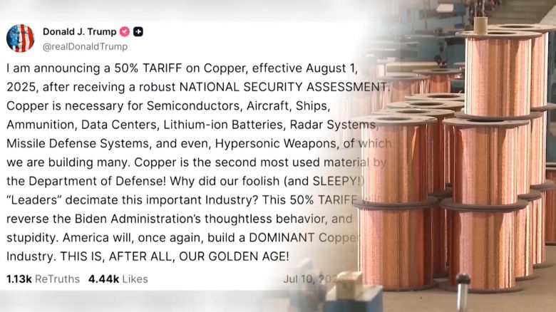 미국이 다음 달 1일부터 구리에 50% 관세를 적용합니다.
