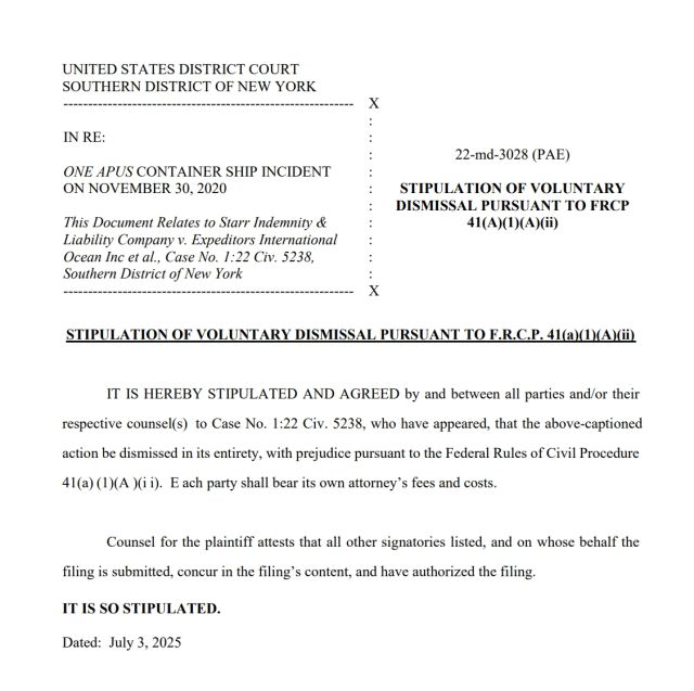 9일(현지시간) 미국 뉴욕주(州) 남부 지방법원은 스타 손해배상 보험회사가 익스페디터스 인터내셔널 오션을 상대로 대위 변제 구상권을 청구한 소송에 대해 당사자 간 자발적 합의에 따른 ‘기각’ 결정을 내렸다. 이 사건은 기각 처리됐으며, 각 당사자는 소송 비용을 자발적으로 부담키로 했다.