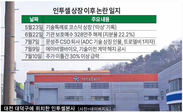 인투셀의 부진 요인은 복합적이다. 지난 6월 말 기관투자자들의 보호예수(락업) 물량 328만여 주(지분율 22.2%)가 해제되며 대규모 매물이 시장에 쏟아진 게 첫 번째다. 7월 초에는 핵심 인력인 문성주 최고전략책임자(CSO)가 돌연 퇴사했다. 문 전 CSO는 글로벌 제약사 길리어드에서 ADC 항암제 '트로델비' 개발을 주도한 1저자로, 인투셀 기술력의 상징과도 같은 인물이었다.