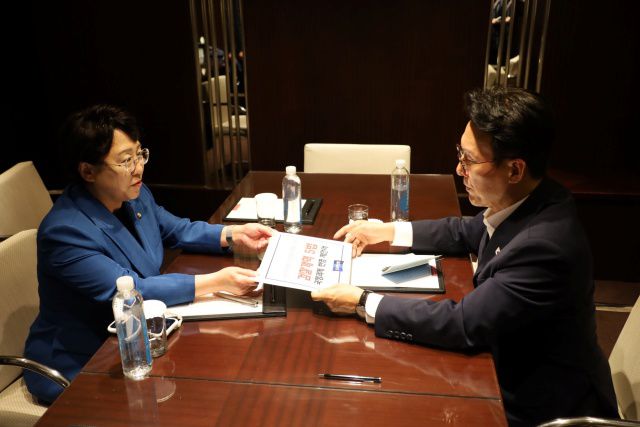 [더팩트ㅣ국회=서다빈 기자] 김선민 조국혁신당 대표 권한대행이 김민석 국무총리를 만나 6·3 대선 당시 야5당 원탁회의에서 합의한 교섭단체 정상화와 결선투표제 도입의 조속한 이행을 촉구했다.