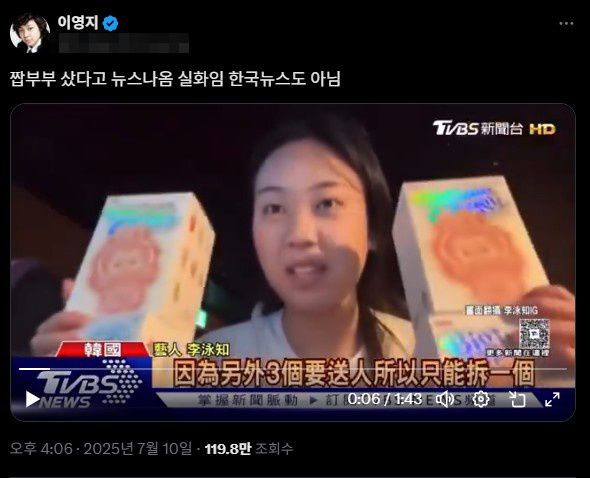10일 대만 TVBS는 “전세계적인 라부부 열풍이 한국에도 퍼져나가고 있다. 이제 많은 아티스트들이 구매와 언박싱에 뛰어들고 있는 가운데 가수 이영지는 ‘히든 에디션’을 생각하고 4개를 한꺼번에 구입했지만 예상 외로 모두 가짜였다. 이에 분노한 이영지는 라이브 방송을 시작해 구매 전 가품에 주의해 달라고 당부했다”는 내용을 보도했다.