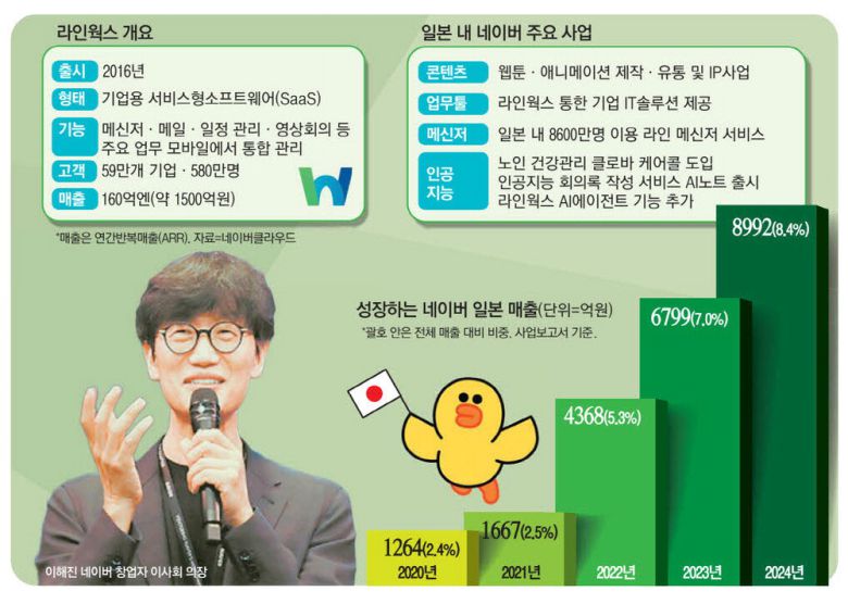시장조사기관 후지키메라에 따르면 라인웍스는 2017년 이후 7년 연속 유료 업무용 메신저 시장 점유율 1위를 지키고 있다. 연 매출 역시 매년 약 40%씩 성장했고 올해 7월 기준 연간반복매출(ARR) 160억엔(약 1502억원)을 돌파했다. 올해 1월 기준 라인웍스를 사용하는 글로벌 고객사는 59만곳, 이용자는 580만명에 달한다.