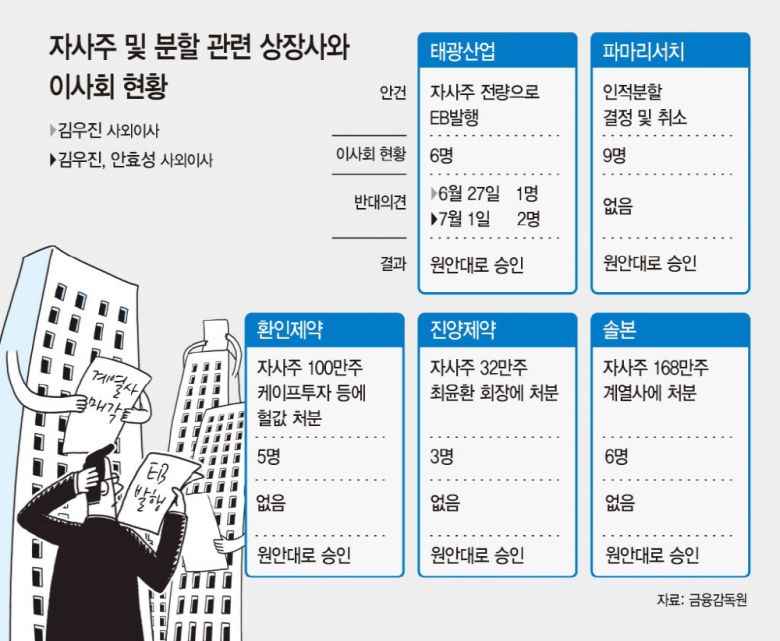 그나마 태광산업 이사회는 반대 목소리라도 냈지만, 최근 자사주를 싼값에 처분하거나 경영권 방어에 활용하려는 기업들의 이사회에선 반대 조차 하지 않았다.