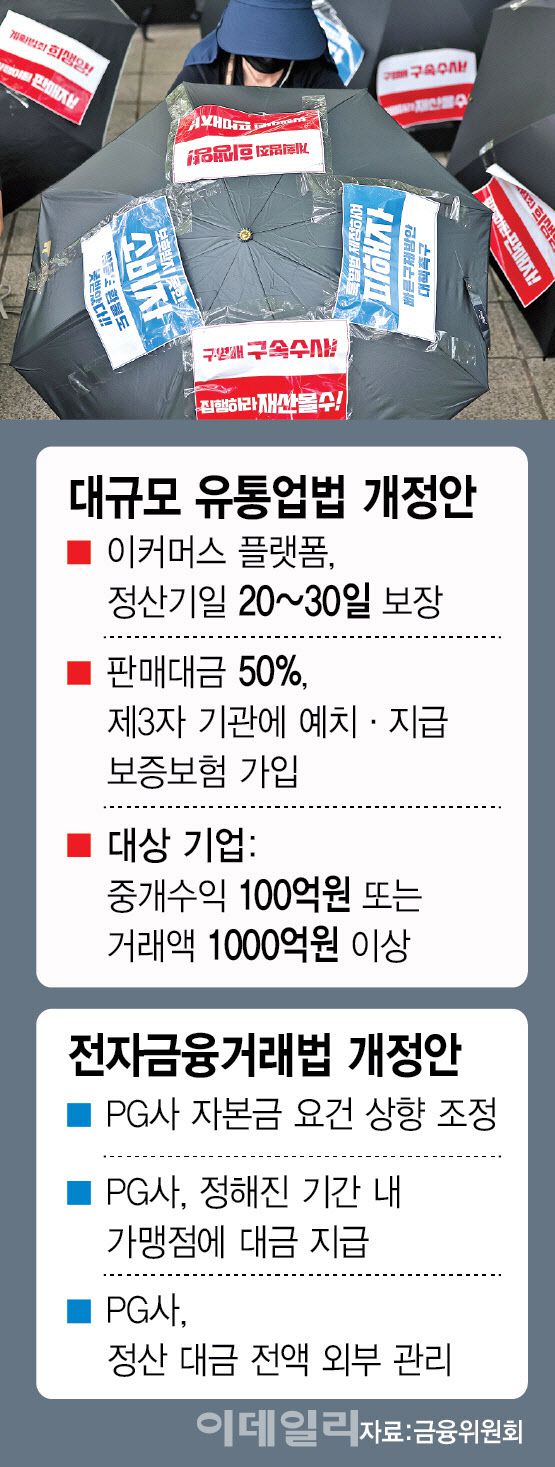 금융당국은 전자지급결제 안정성을 높이기 위한 제도개선을 추진하고 있다. 강민국 국민의힘 의원이 대표발의한 전자금융거래법 개정안은 입점업체 같은 가맹점에 돌아갈 정산금액 100%를 외부관리하도록 명시했다. 그러나 지난 10월 발의된 이 법안은 9개월간 국회에 계류돼 있다. 그간 윤석열 전 대통령의 비상계엄 사태 등 정치적 사안으로 인해 법안 심사 자체가 후순위로 밀렸던 탓이다.