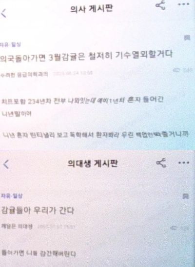 [아이뉴스24 김다운 기자] 최근 의대생과 의사들만 가입할 수 있는 한 온라인 커뮤니티에 의정 갈등 상황 속 집단행동에서 이탈한 의대생과 전공의를 대상으로 보복을 예고한 게시글이 올라와 논란이다.