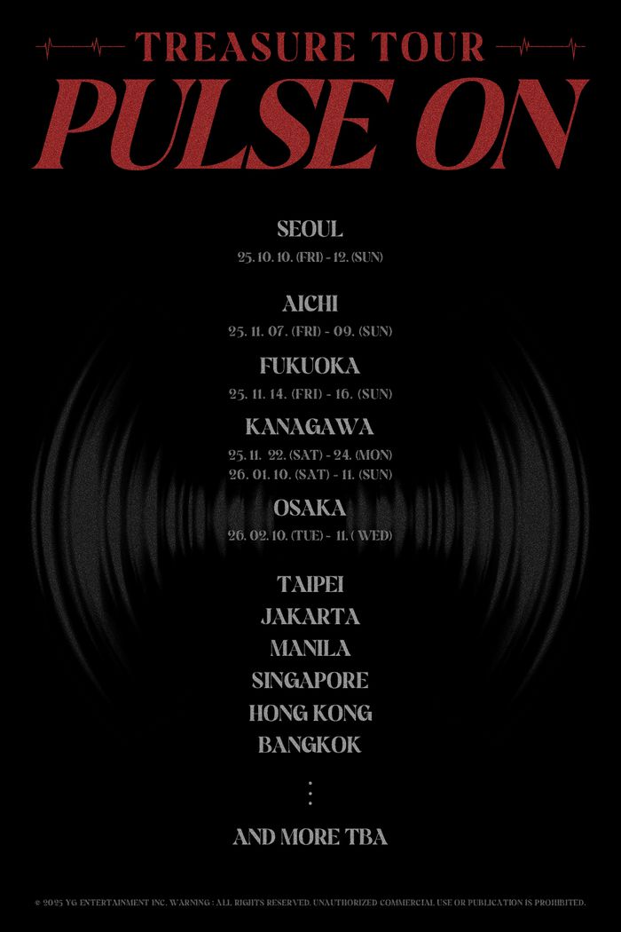 YG엔터테인먼트는 10일 트레저의 새 투어 ‘TREASURE TOUR [PULSE ON]’의 상세 일정을 공개했다. 공개된 포스터에 따르면 트레저는 오는 10월 10일부터 12일까지 서울에서 3회 공연을 시작으로, 아시아 11개 주요 도시에서 글로벌 팬들과 만날 예정이다.