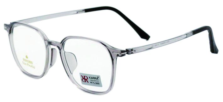 나도코리아에서 판매하고 베르디아이웨어에서 제조한 카라 ECO+ KR86007 그레이 컬러 모델은 친환경 플라스틱 소재인 G50 소재를 사용한 카라 에코 플라스틱 시리즈 새로운 버전이다. 힌지 일체형 엔드피스 장식에 클래식한 무드를 더한 것이 특징이다.