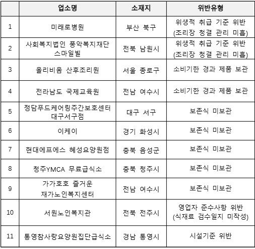 사회복지시설, 산후조리원 등 11곳이 식품위생법 위반으로 식약처에 적발되었다. |