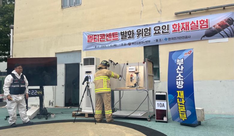 부산소방재난본부는 10일 부산 연제구 본부 훈련탑 앞에서 멀티탭 발화 위험 화재 실증 실험에 나섰다.