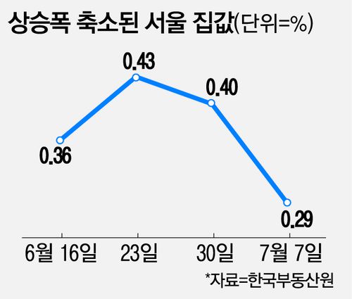 10일 한국부동산원이 발표한 7월 첫째주(7일 기준) 주간 아파트 가격 동향에 따르면 이번주 서울 아파트값은 전주 대비 0.29% 오르며 23주 연속 상승했다. 하지만 상승폭은 0.43%→0.40%→0.29%로 2주 연속 줄었다. 정부가 수도권 주택담보대출(주담대) 한도를 6억원으로 묶는 초강경 6·27 대책을 내놓은 데 따른 영향으로 풀이된다.